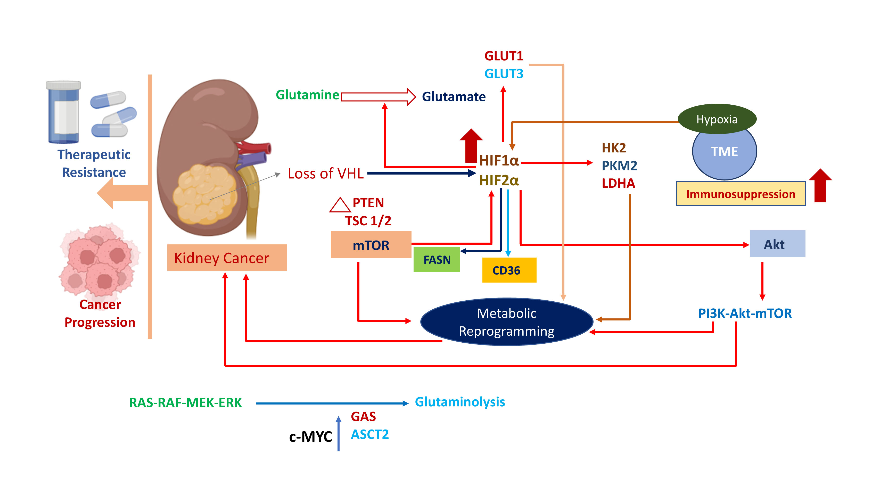 Figure 1. Metabolic reprogramming drives kidney cancer progression. Stabilization and upregulation of HIF1α and HIF2α occur because of Loss of VHL. Metabolic pathways are dysregulated and rewired by alteration of several mediators (GLUT1, GLUT3, HK2, LDHA, etc.) which are activated by the action of HIF1α and HIF2α. Hypoxia is initiated in TME leading to immunosuppression through suppression of cytotoxic T-cells.